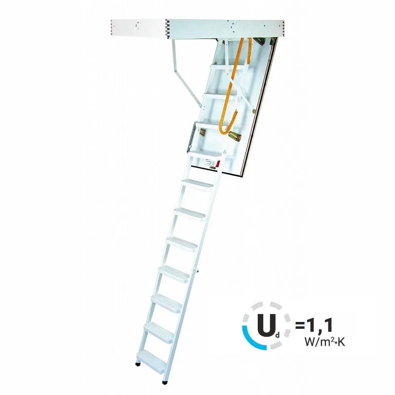 Износоустойчивая лестница для холодных помещений, приспособлена, как для частого использования так и для продолжительного простаивания. Белый цвет крышки люка (толщина 3,3 см) гармонично интегрируется в интерьер помещения и закрывается, маскируясь в один уровень с потолком.