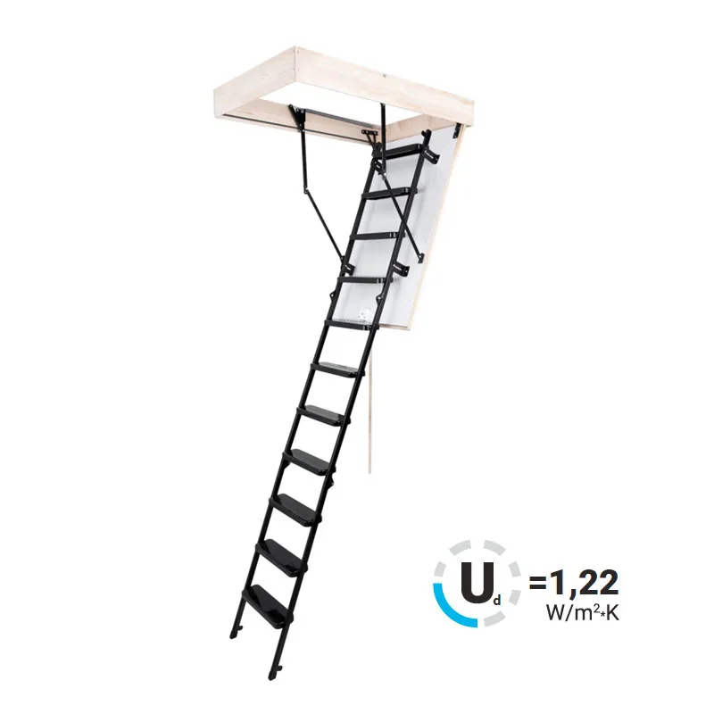 Лестница складная трехсекционная. Рабочая поверхность полностью выполнена из металла и покрашена порошковой краской. Термоизоляционная крышка типа "сэндвич", толщиной 30 мм, утеплена пенопластом, облицована с двух сторон ДCП белого цвета.