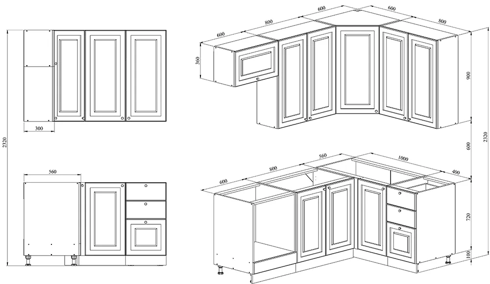 Благодаря модульной системе такая кухня может быть собрана зеркально, а, например, верхние шкафчики "под стекло" и "глухие" заменены местами. В стандартной комплектации нижние тумбы оснащены регулируемыми ножками высотой 100 мм и цоколем из массива сосны высотой 95 мм.