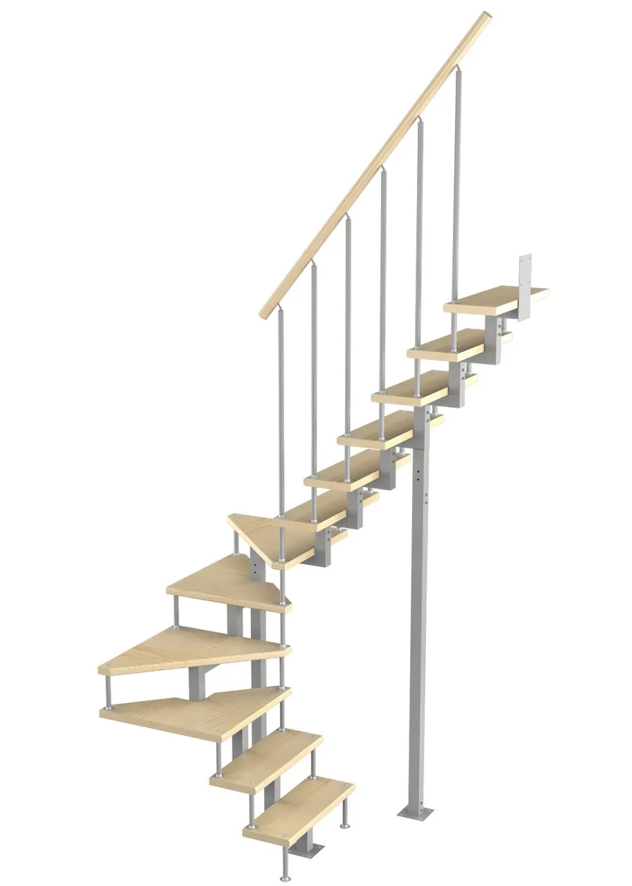 Лестница представлена в двух вариантах: с поворотом направо и с поворотом налево. Благодаря возможности регулировать высоту шага с помощью пластиковых вставок (входят в базовый комплект), высоту лестницы можно варьировать в пределах от 2860 до 3090 мм. Кроме того, купив дополнительную секцию для этой лестницы, можно поднять высоту до 3320 мм. Поручень изготовлен из массива бука в тон ступеням. Ступени и поручень покрыты износостойким защитным лаком.